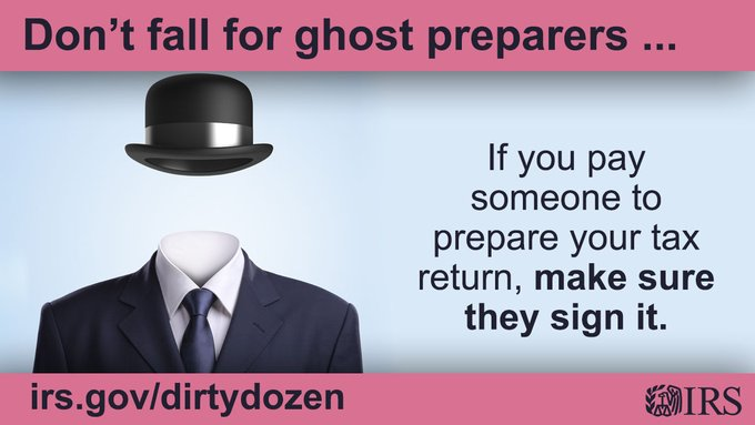 8. Ghost tax return preparers: A ghost preparer is not some spectral tax entity. It is a tax preparers who completes a client’s return, but refuses to sign it and/or refuses to include a Preparer Tax Identification Number (PTIN). This too often is the case where a preparer’s fee is based on the size of the refund.