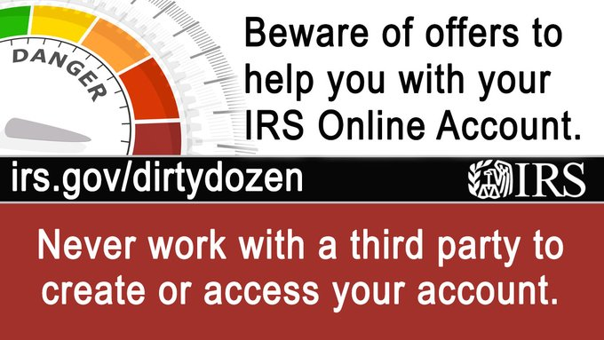 5. Identity theft involving IRS Individual Online Account access: Swindlers can pose as a “helpful” third party and offer to assist taxpayers looking to create an Individual Online Account at IRS.gov. Of course to do this, the scammers need your personal information.