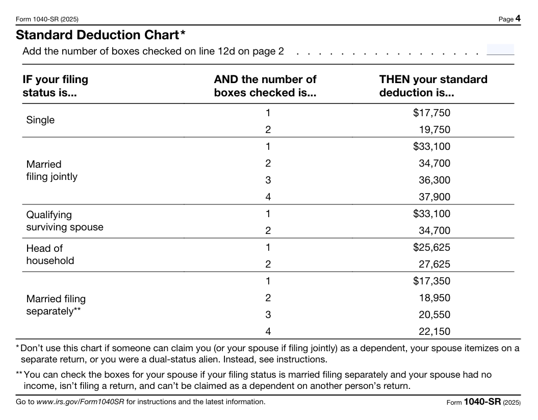 When the Form 1040-SR debuted for the 2019 tax year, those deduction amounts were $12,200 for single filers; $18,350 for heads of households; and $24,400 for joint filers. For the 2020 tax year, those amounts were increased to $12,400 for single taxpayers; $18,650 for head-of-household filers; and $24,800 for married jointly filing couples. (You can find the increases for the 2025 and coming 2026 tax years in this post on the latest inflation adjustments.)