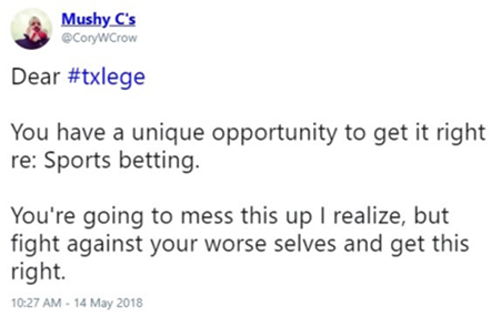 I agree with Crow. The staunchly conservative Texas Legislature will mess this up, basically by maintaining its no-bets stance.