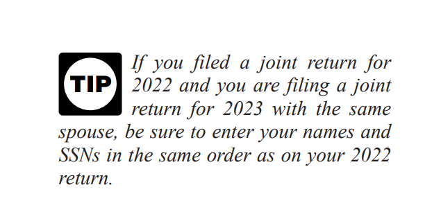 So, as noted in the joint filing tip above from the Form 1040 instructions for the current tax season, if the husband’s name was first on the 2022 return, it should also be listed first on the 2023 return. Or vice versa.